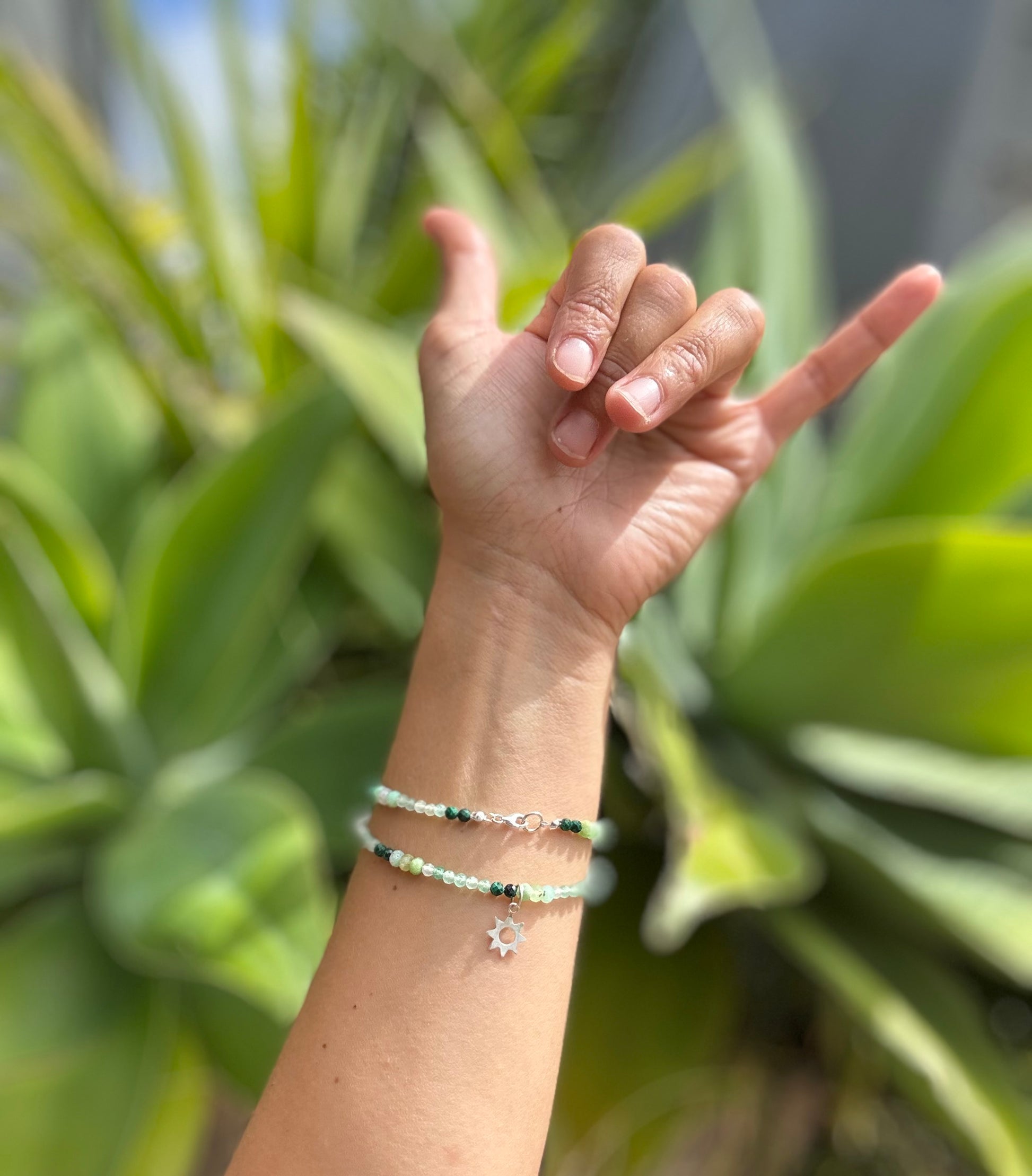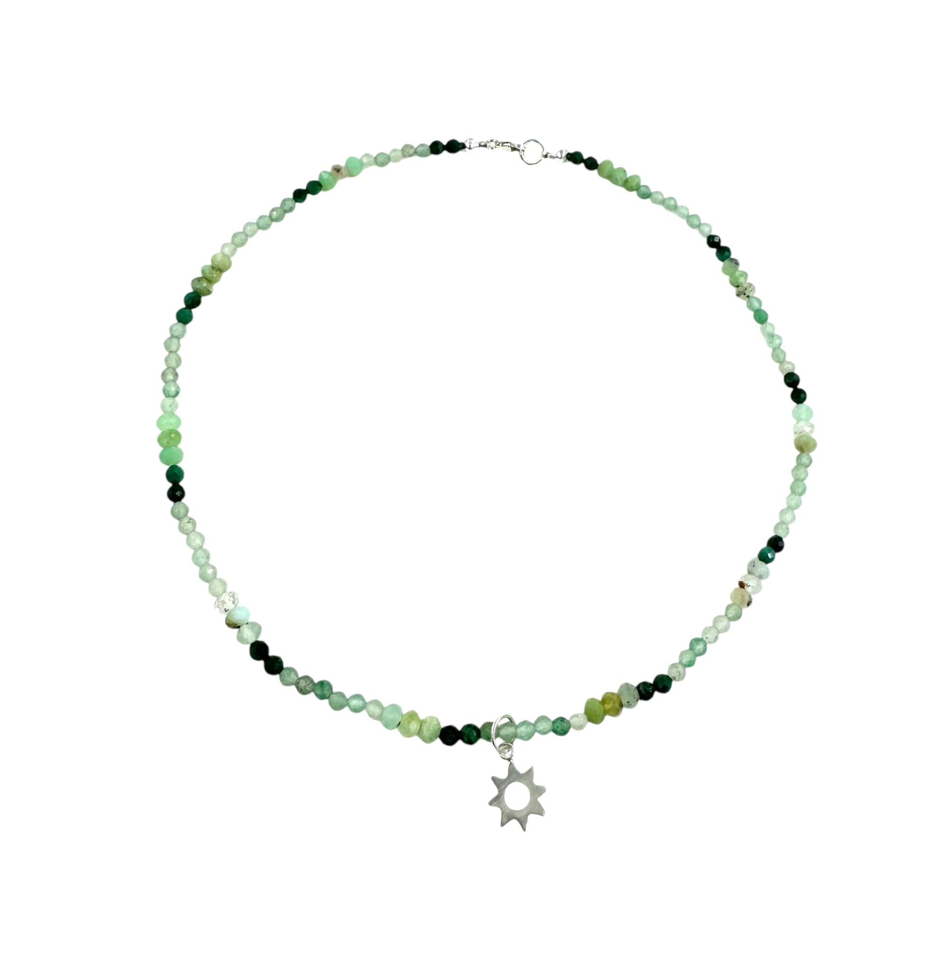 The combination of these stones together is believed to bring happiness, positive change and wealth. Using natural 3mm/4mm gemstones green aventurine, chrysoprase & malachite compliment each other in similar shades of green. Finished with a sterling silver sun charm for a subtle glimmer.